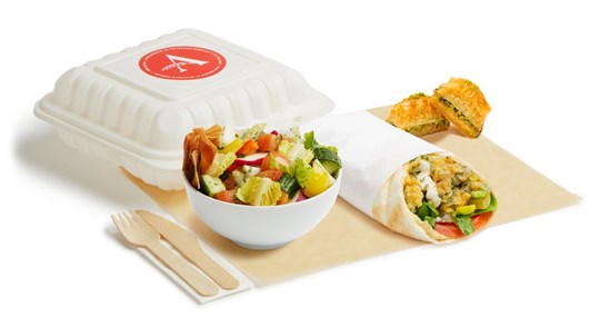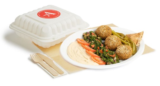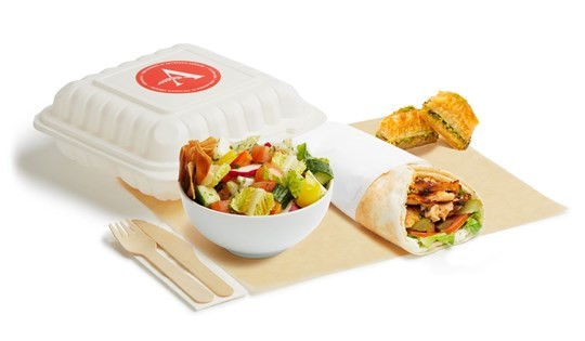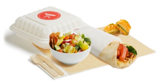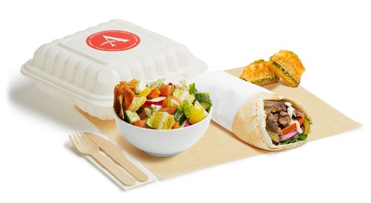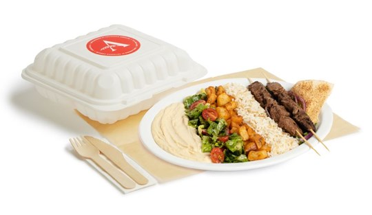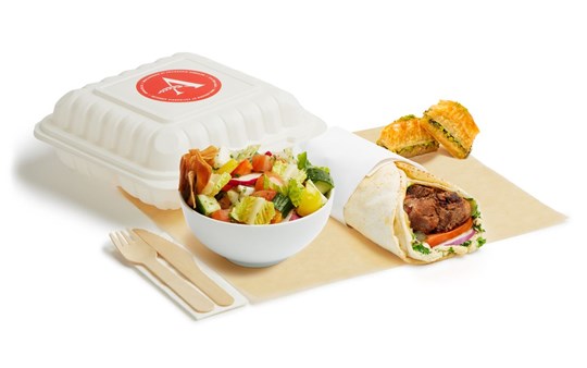 <p>Meat shawarma with rice and spicy potatoes with a salad of the day, parsley, onions, sesame sauce, hummus and a pita. Served hot. With utensils.</p>