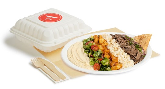 <p>Shawarma à la viande sur riz et patates épicées avec salade du jour, persil, oignons, sauce au sésame, hummus et un pain pita. Servi chaud. Ustensiles inclus.</p>