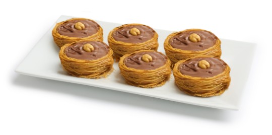 Nid de vermicelles croustillants, généreusement farci de noix croquantes. A crispy vermicelli nest, generously filled with crunchy nuts.