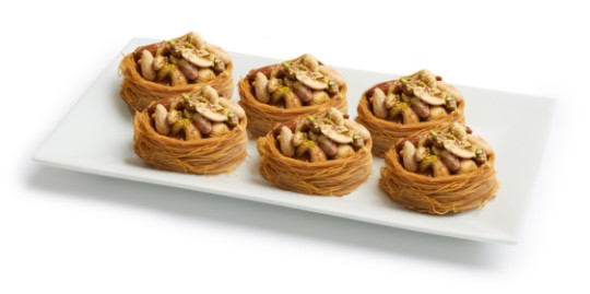 <p>Nid de vermicelles croustillants farci au Ashta (crème de ricotta) et garni de pistaches.</p> <hr> <p>A crispy vermicelli nest filled with Ashta (ricotta cream) and topped with pistachios.</p>