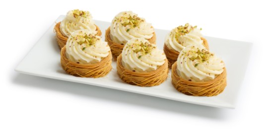 Nid de vermicelles croustillants farci au Ashta (crème de ricotta) et garni de pistaches. A crispy vermicelli nest filled with Ashta (ricotta cream) and topped with pistachios.