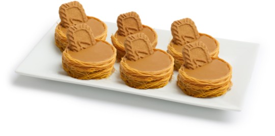 Nid de vermicelles croustillants, généreusement farci de chocolat Lotus et couronné d’un biscuit Lotus. A crispy vermicelli nest, generously filled with Lotus chocolate and topped with a Lotus biscuit.