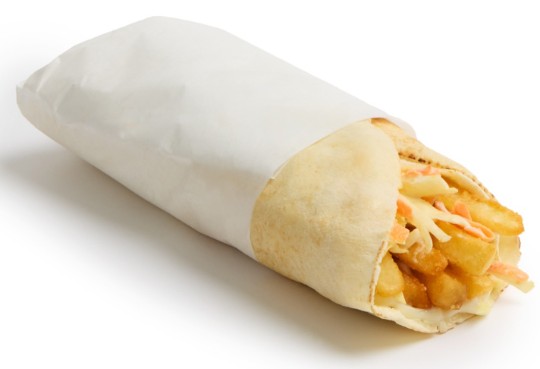 <p>Pain pita garni de frites croustillantes, de salade de chou, de ketchup et de sauce à l’ail.</p> <hr> <p>Pita bread filled with crispy fries, coleslaw, ketchup, and garlic sauce.</p>